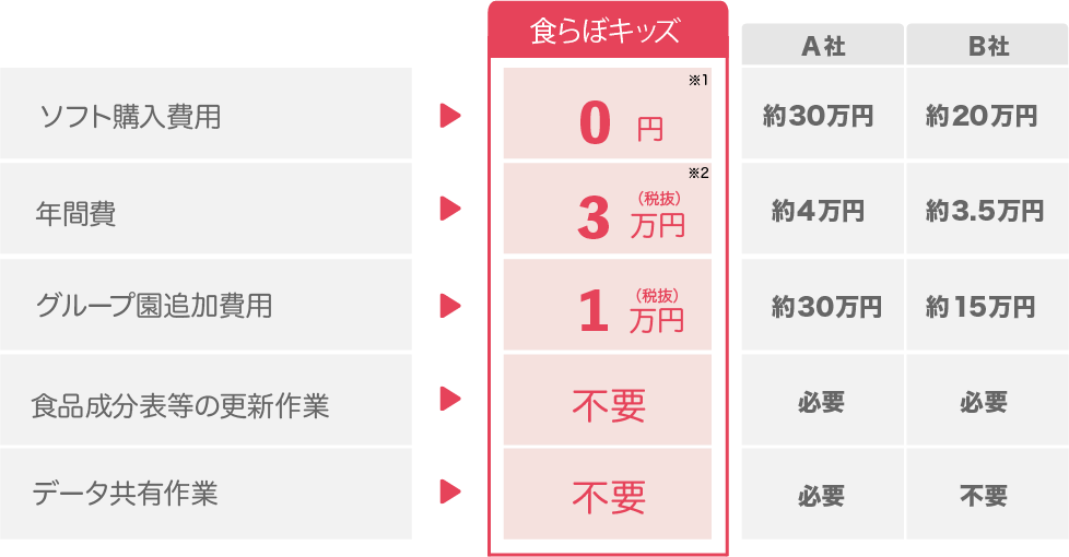 ※2)ご利用料金は12ヶ月分の一括払いとなっておりますため、「年間費」と記載しております。また、グループ園で追加にご契約される場合には、さらに安価な1.8万円/年(税抜)でご利用頂けます。1ヶ月は完全無料でお使い頂くことができ、かつその期間は12ヶ月分にカウントされませんので、安心してご利用し、お決めください。
